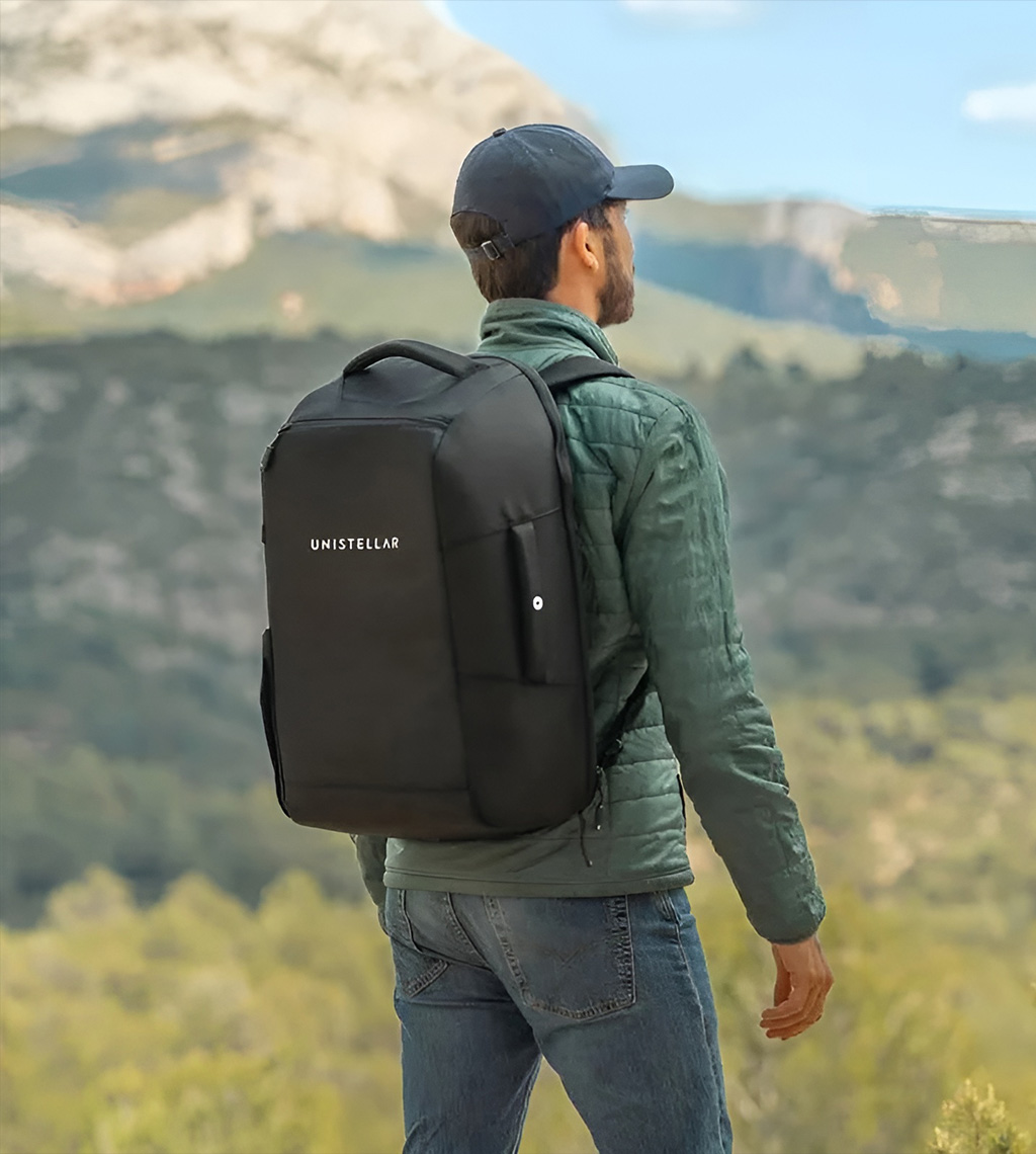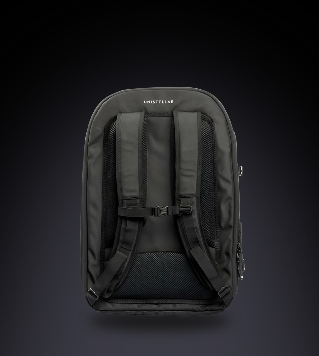 Ihr Teleskop soll nicht im Schrank verstauben. Mit dem **Original-Rucksack für Unistellar Odyssey** nehmen Sie Ihr Observatorium überallhin mit – sicher, bequem und stilvoll.