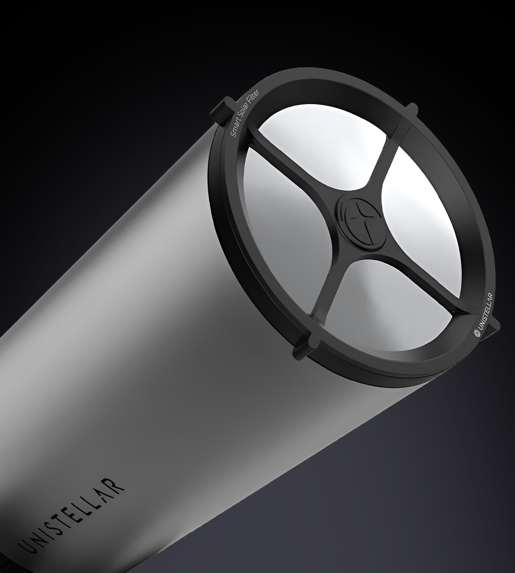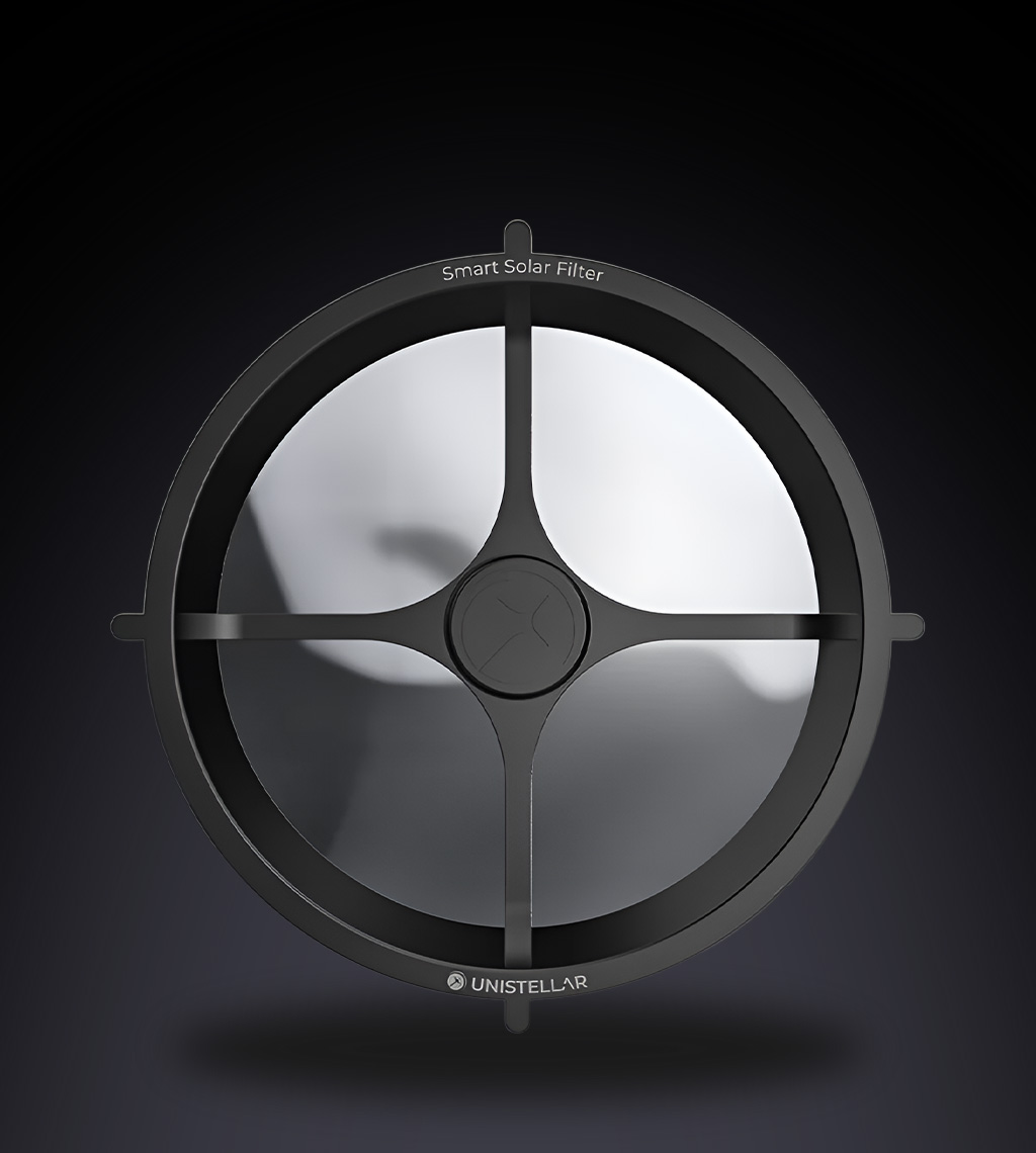 Machen Sie Ihr leistungsstarkes Teleskop fit für den Tag. Der **Smart Solar Filter für eVscope & Equinox** ermöglicht gefahrlose Sonnenbeobachtung mit der bewährten Unistellar-Technologie.