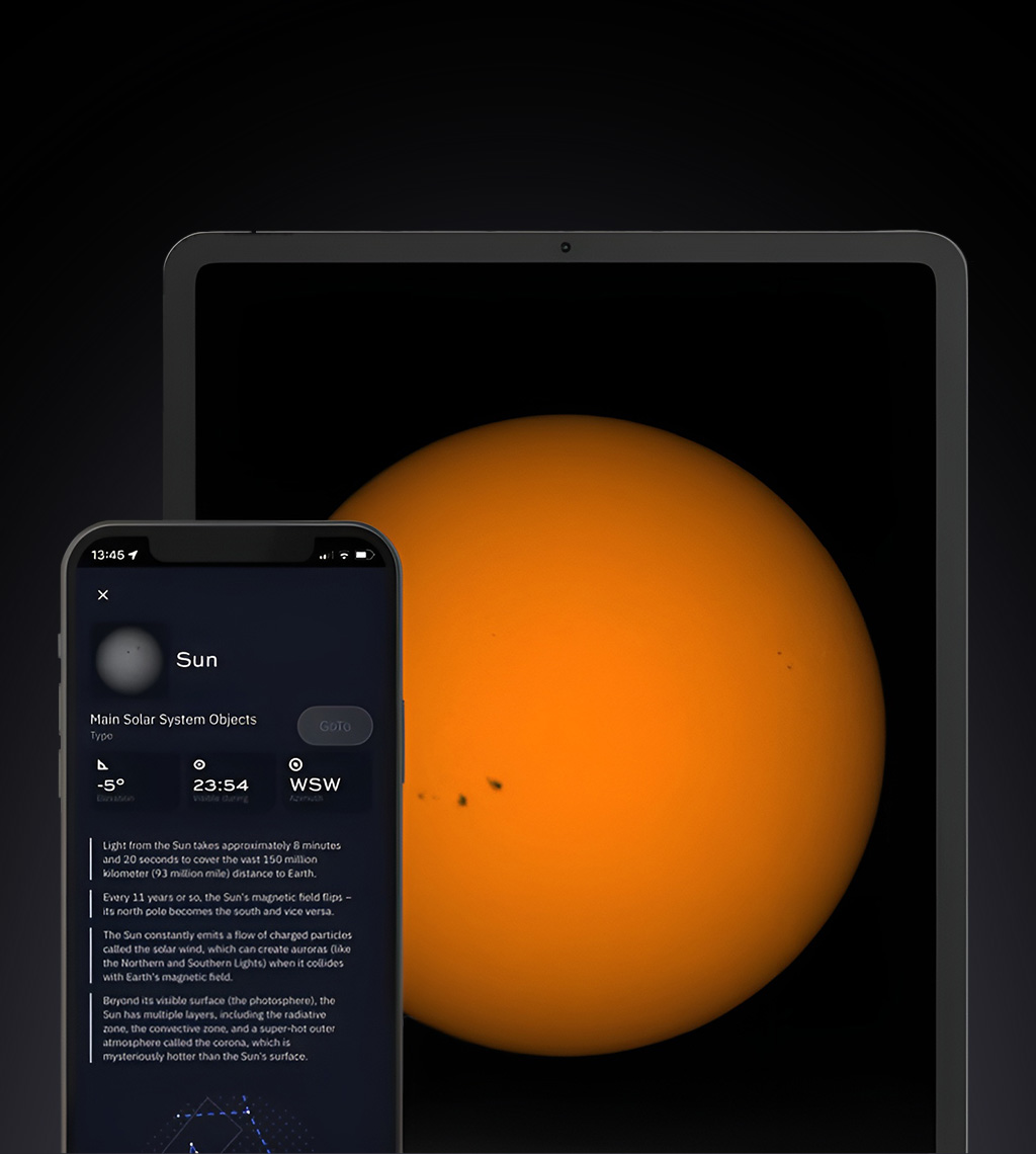 Unvergessliche Ereignisse: Werden Sie Zeuge von Sonnenflecken, Transiten oder Sonnenfinsternissen und teilen Sie die Bilder live mit Freunden.